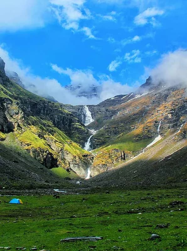Day 5:Day 5: Dhanderas Thatch → Upper Waterfall Camp Trek 3 km (2–3 hrs) to Upper Waterfall Camp (13,100 ft). Overnight in twin-sharing camp.
