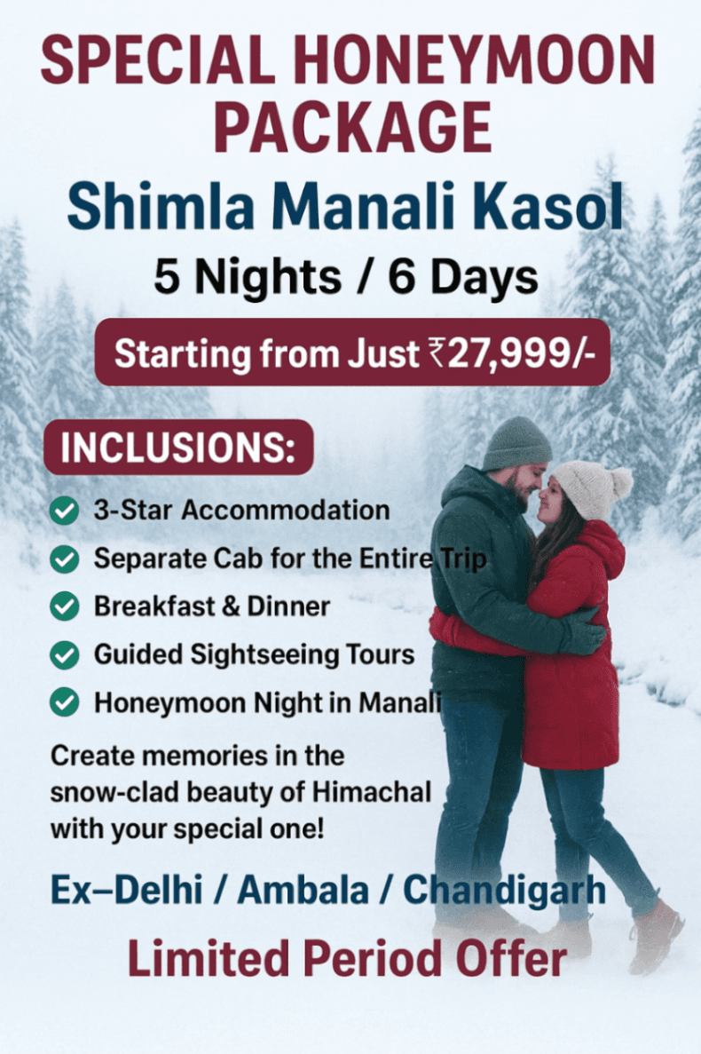 6 Days Of Himalayan Bliss. 2 Nights Shimla 2 Nights Manali 1 Night Kasol Riverside Camp Special:- 1 Night Honeymoon Inclusion In Manali.